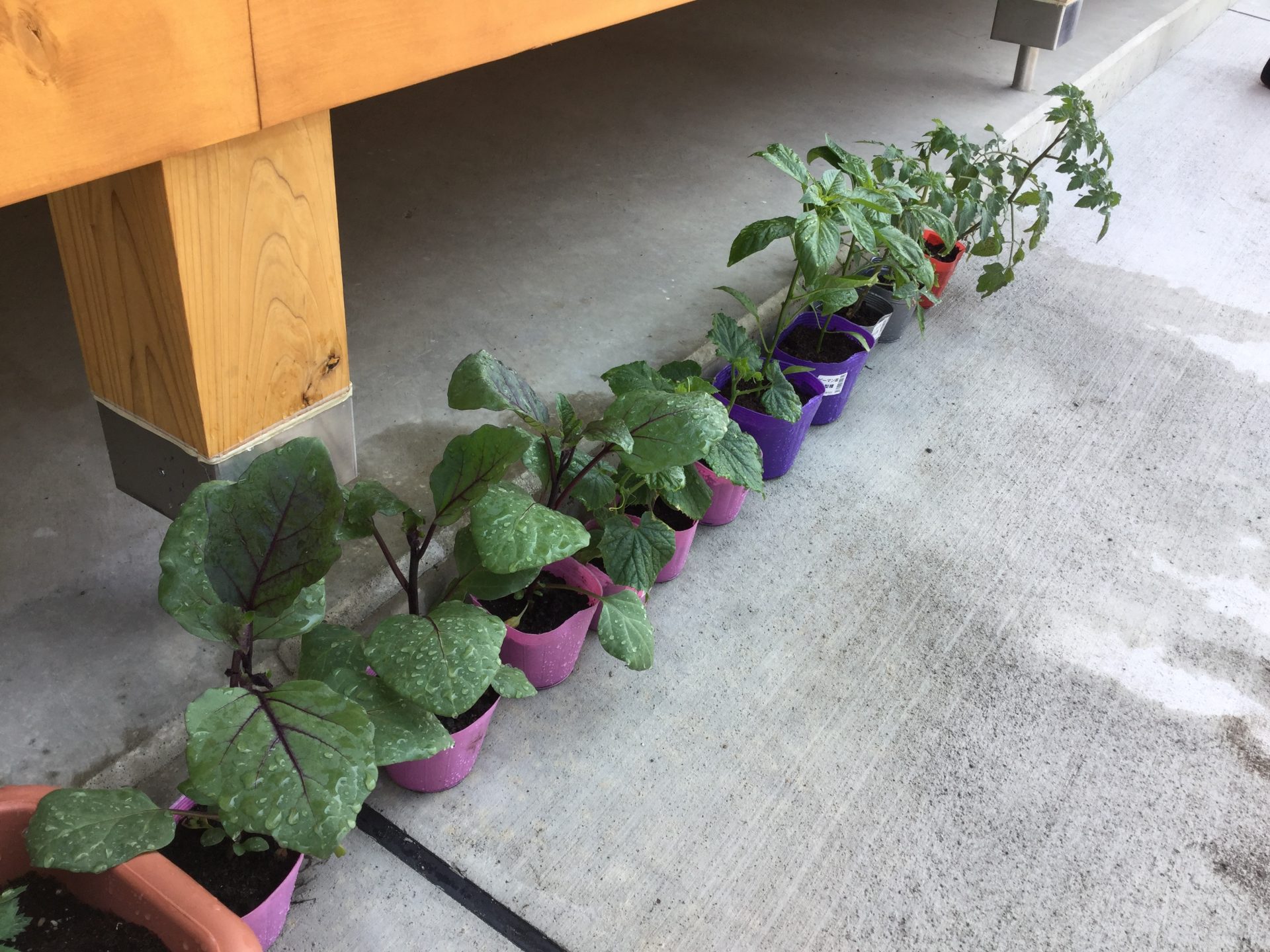 畑仕事の準備が完了しました 2017年6月10日 近隣の某農業顧問にお手伝い頂いて、畑のマルチ作業が終了しました。これによって、保温・保湿・雑草抑制などの効果が得られるとのことです。準備した苗は、ナス、きゅうり、ピーマン、トマトです。来週利用者さんと一緒に植える予定です。