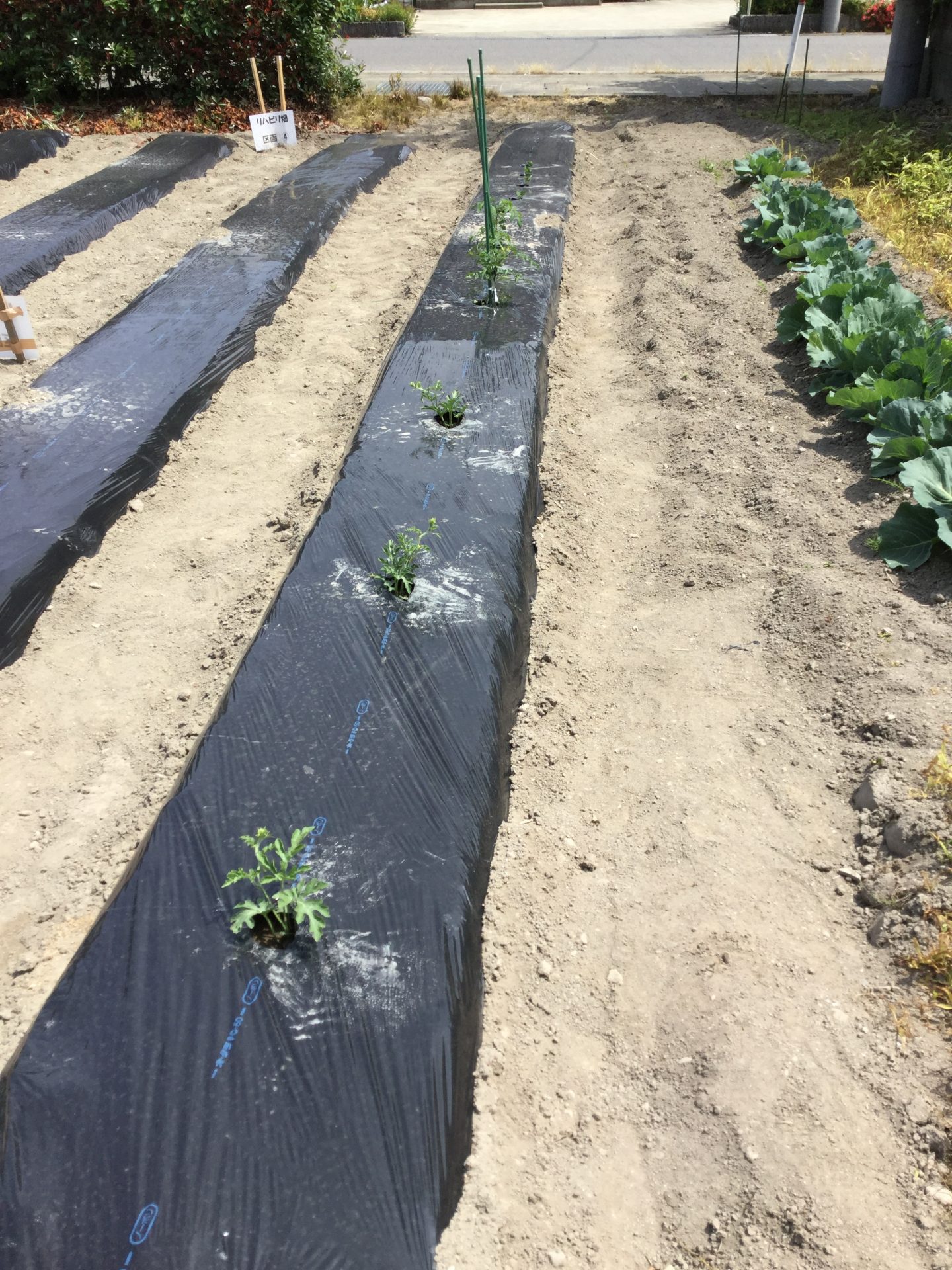 手前から、スイカ、トマト、豆です。利用者さんが植えてくれました。近隣農家のお話ですと、今年は稲も野菜も生育が悪いようです。