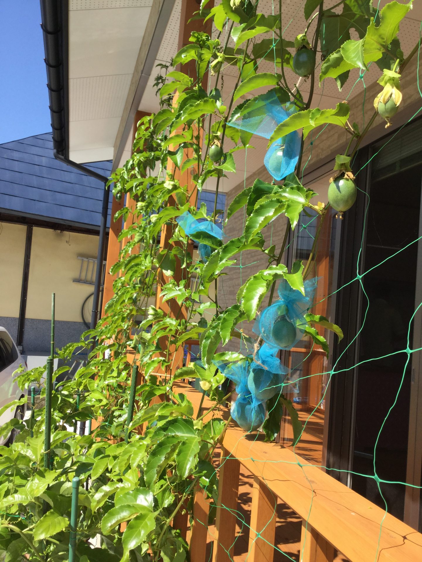 6月に植えたパッションフルーツが、実りの時期を迎えています。詳しい利用者さんのアドバイスのもと、栽培をしています。じっくりと、落ちるのを待つそうです。落ちてはいけないと思い、ネットをかけたのですが、食べるのは果肉でなく種周辺のジュクジュクしたところなので、落ちても問題はないそうです。なので、ネットは不要だそうです。明日にでも取り外します。