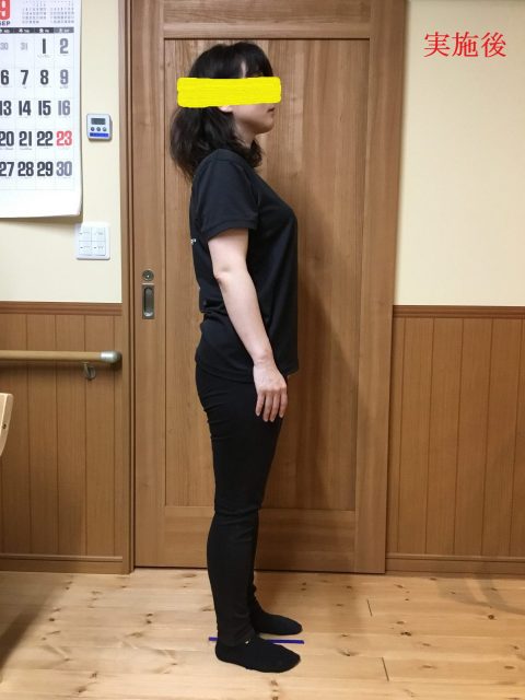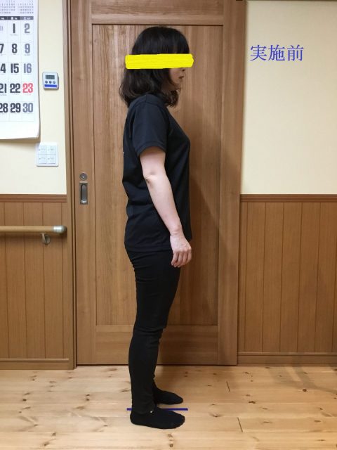 一部の方にご協力頂きまして、エクササイズ前後での姿勢の変化を掲載させてもらいました。エクササイズ前では、やや前に体が突っ込んだ姿勢ですが、エクササイズの後はそれが改善されて地面をしっかりと捉えて立っていることがわかります。