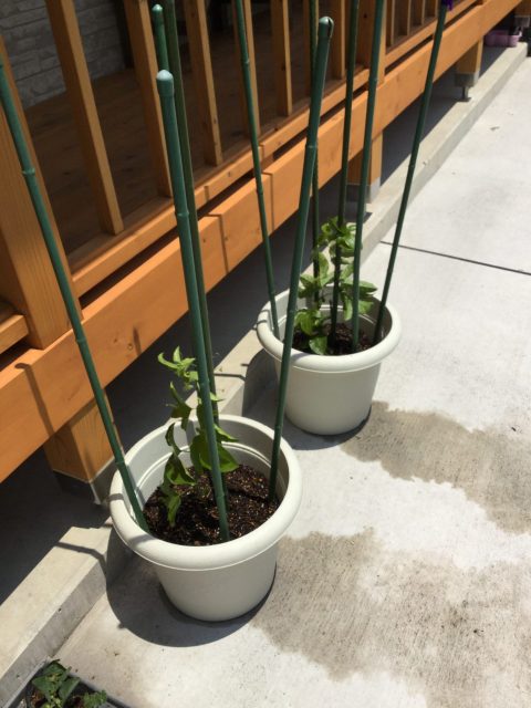 パッションフルーツ、ナス、トマト、豆を植えて頂きました。スイカは花が咲きました。収穫が楽しみです。