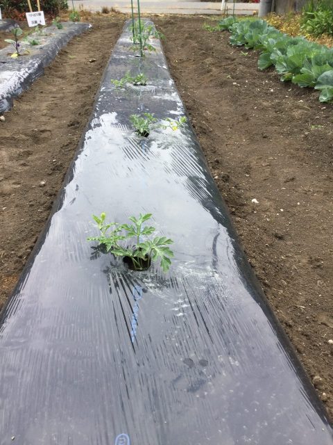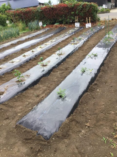 近隣の某農業顧問にお手伝い頂いて、畑のマルチ作業が終了しました。これによって、保温・保湿・雑草抑制などの効果が得られるとのことです。準備した苗は、ナス、きゅうり、ピーマン、トマトです。来週利用者さんと一緒に植える予定です。