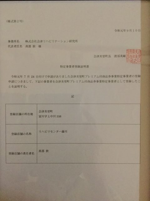 この度、会津美里町よりプレミアム付き商品券事業特定事業者として登録証明書を頂きました。来月から発売される、プレミアム付き商品券で、杖、車いす、シューズ、紙パンツなどの介護用品を、お買い求め頂けます。詳しくは、以下より会津美里町のホームページをご覧ください。